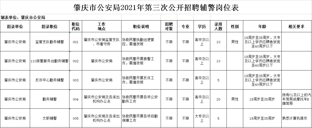6、崗位所需的其他條件。具體見《肇慶市公安局2021年第三次公開招聘輔警崗位表》。